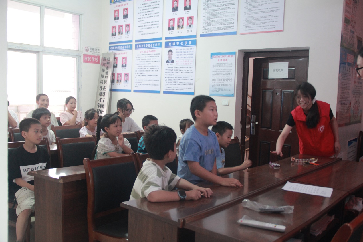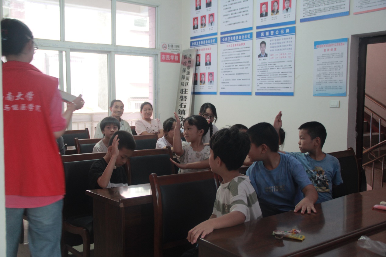 防溺水安全工作是一项长期、复杂、艰巨的系统工程。天气逐渐转热,溺水事故进入危险期、易发期、高发期。为防范青少年擅自到河流、水库、塘坝游泳、玩耍,确保青少年生命安全,强化防溺水安全教育,增强防溺水安全意识,掌握防溺水知识和遇险逃生、自救互救技能,7月19日,实践队成员吴蔚同学在磐石镇欣欣社区开展了防溺水宣传讲座。