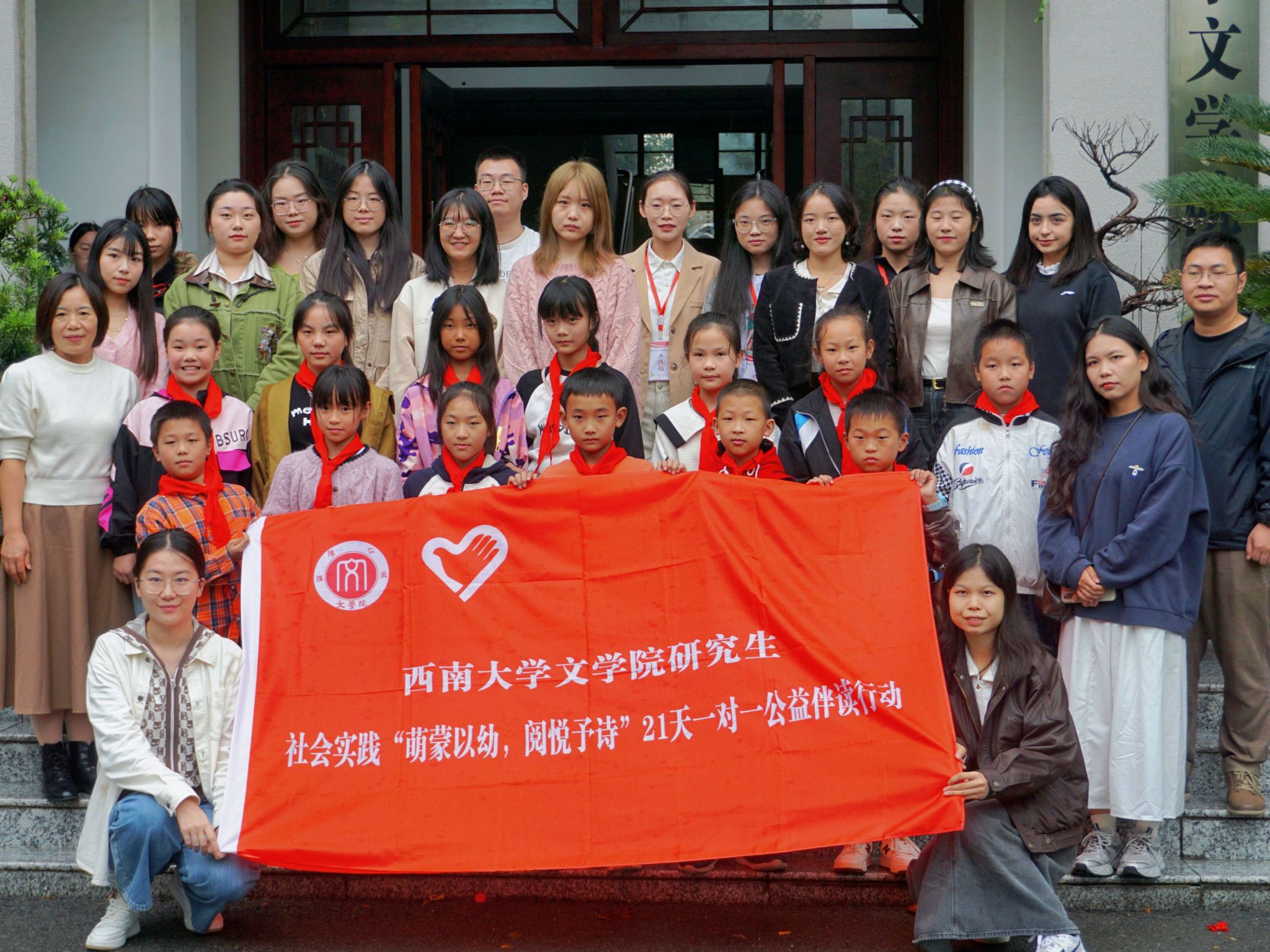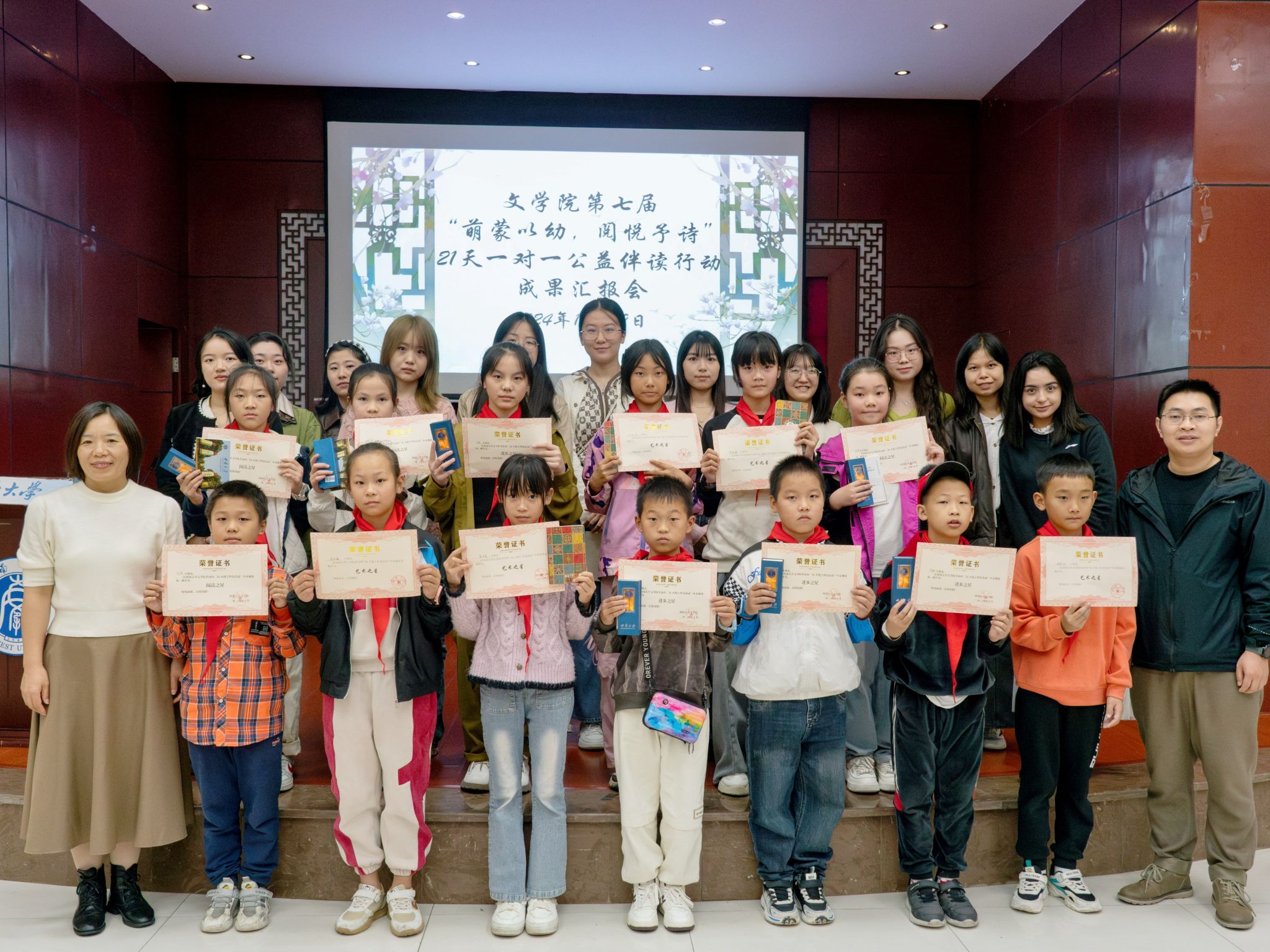 10月19日上午,文学院研究生会于学校八一礼堂举行第七届“萌蒙以幼,阅悦予诗”21天一对一公益伴读行动成果汇报表演。在文学院研究生辅导员凌飞的带领下,来自重庆市合川区清平镇川心小学的13名小朋友及其老师、家长,与文学院的研究生志愿者们同书写了一段关于阅读、陪伴与成长的美好篇章。