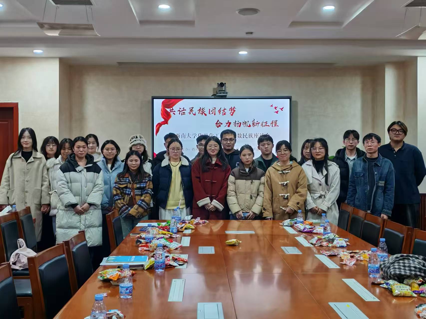 会议尾声,石老师对此次座谈会的意义表示肯定,强调了民族团结是中华民族伟大复兴的重要基石,并引用第二十届少数民族运动会主题歌当中的一句歌词“一颗心,一个圆,一齐拥抱紧相连”表达了各民族团结、和谐共融的美好愿景。希望同学们通过这次交流座谈会更加深刻地认识到民族团结的重要性,坚定共同推动中华民族繁荣发展的信心和决心,将今天的收获转化为前进的动力,不断提升自己的综合素质和能力水平,努力做有家国情怀的爱国者、做中华民族优秀文化的传播者。